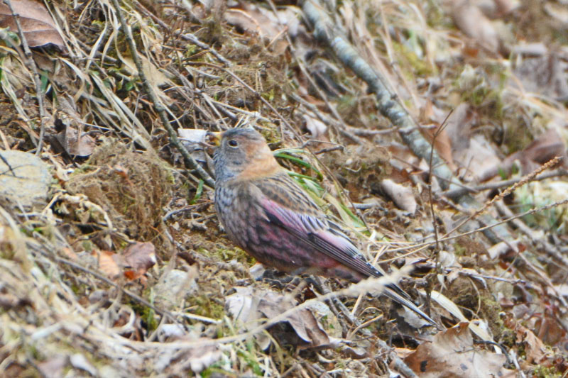 少し、坂を下ったところで、探してみると、なにか地面に降りています。覗いてみると、ハギマシコならぬミヤマホオジロが、カシラダカの群れに混ざって、エサ取りをしていました。